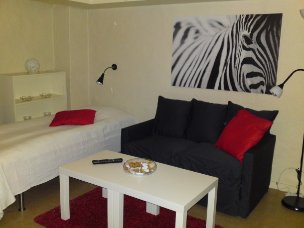 1 rum med pentrykök, dusch och toalett, komlett möblerad. I lägenheten finns internet, TV mm. Fullt utrustat minikök med kyl, micro, kaffebryggare, brödrost, mm. Liten uteplats med plastmöbel. Parkeringsplats för en bil ingår i hyran. Ca 150 m till spårvagnshållplats, endast 8 min till Gbg centrum